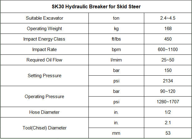 Machine Compatibility: Ensure the breaker’s requirements for hydraulic flow and pressure are met by your skid steer model (e.g., suitable for models like the SK30).